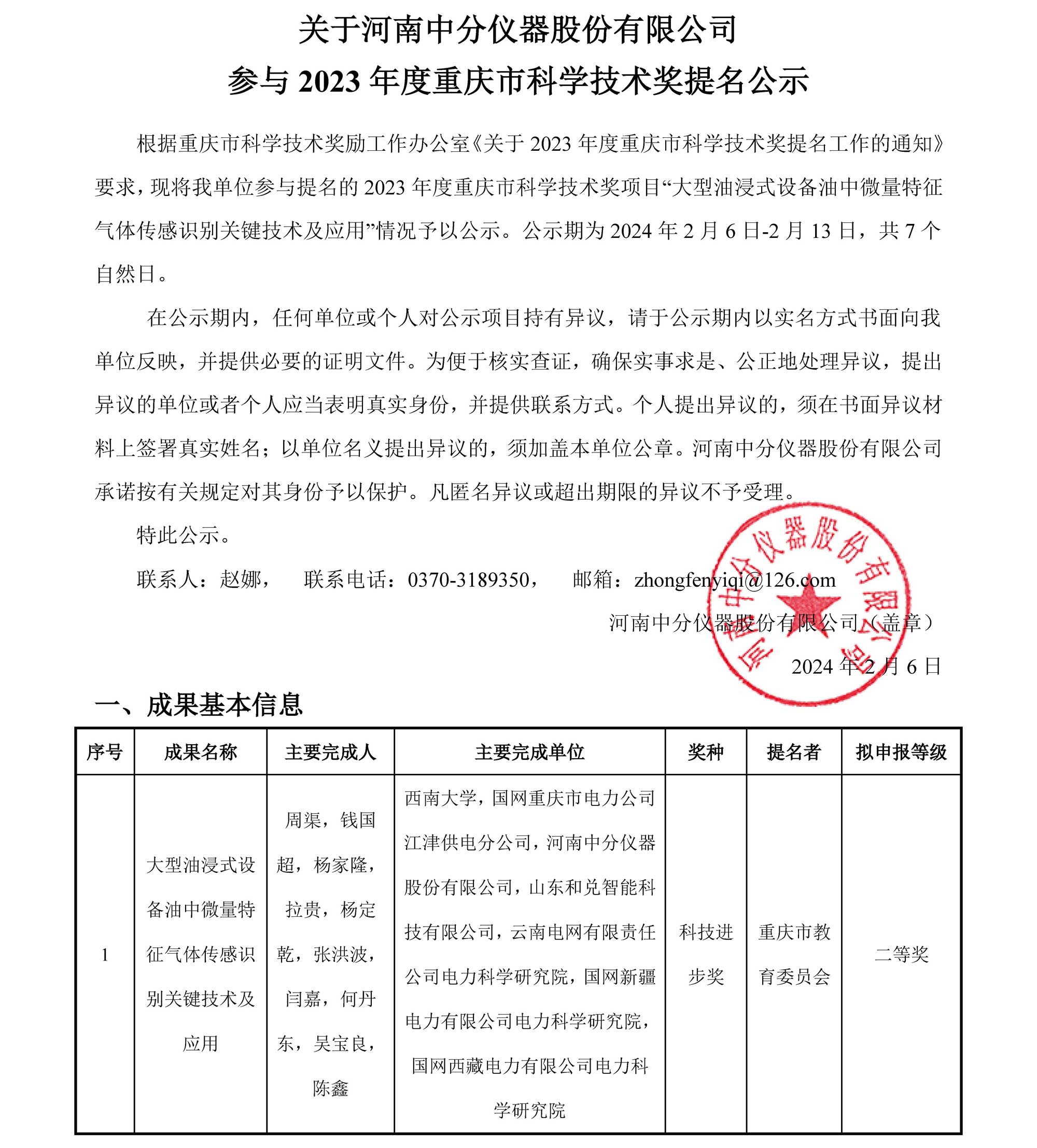 關(guān)于河南中分儀器股份有限公司參與2023年度重慶市科學(xué)技術(shù)獎(jiǎng)提名公示